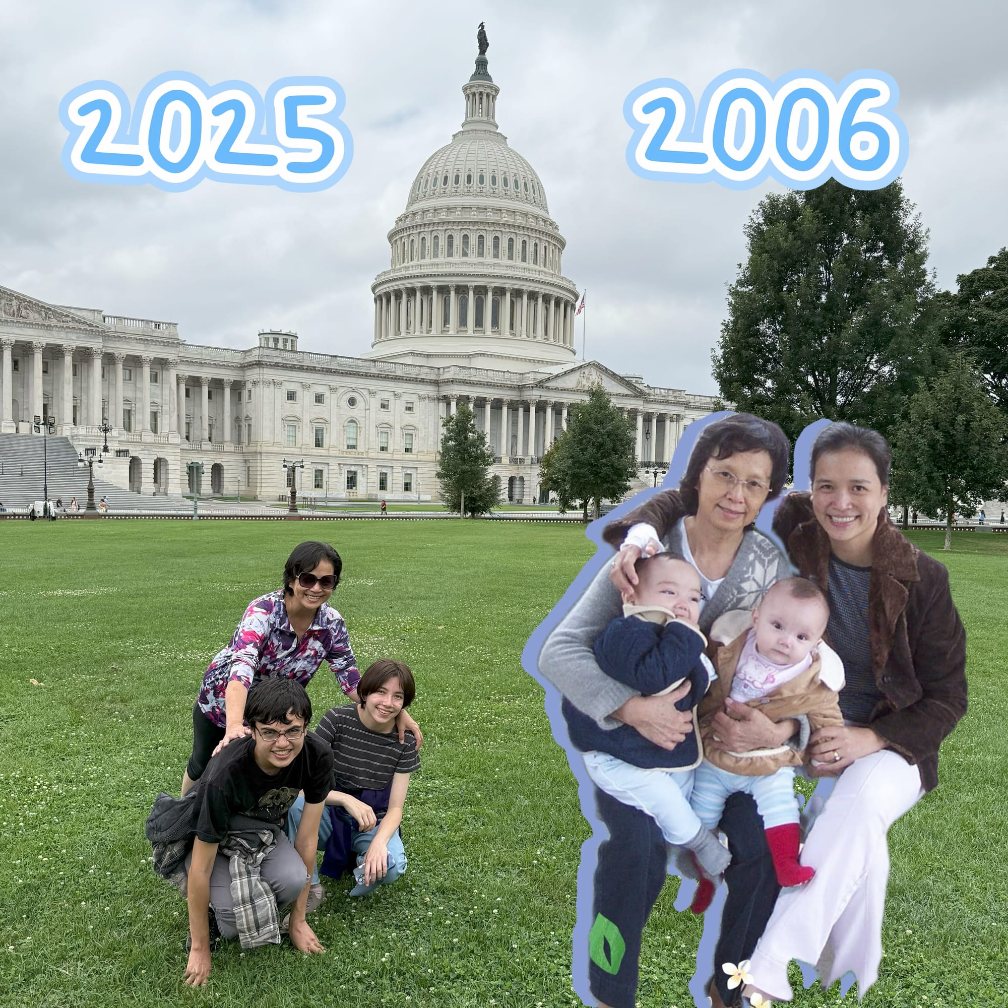走进大厅,历史与现实在石壁间悄然对话。孩子们在展厅里东张西望,我站在他们身后,忽然被一阵旧记忆击中:2006年,我们第一次带着才六个月大的双胞胎出游,目的地正是这里——华盛顿DC。那时的我,一路忧心忡忡却又满怀兴奋,和母亲一起,三个大人守护着两个婴儿——怕他们饿了、冷了,更怕他们在庄严的殿堂里突然哭闹……此后的许多年,因我的身体状况,我们几乎再未远行。而今天重回此地,想起那张抱着两个胖娃娃的合影,才发觉当年的种种担忧,早已沉淀为岁月里最柔软的温度。